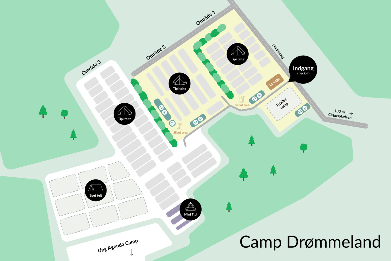 Drømmeland 1 og 2 er placeret på boldbanerne. Her skal der være stille mellem kl. 22:00-08:00 hver dag. Der er opsat et fællestelt på området, som må benyttes af alle med camp armbånd til camp drømmeland. Fællesteltet åbner hver morgen kl. 8:00 og lukker kl. 22:00.